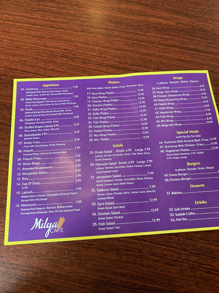 Welcome to Milya Cafe, a delightful haven for Middle Eastern cuisine located in Blue Ash, Ohio. This restaurant's menu features a vibrant array of flavors that captures the essence of the region.